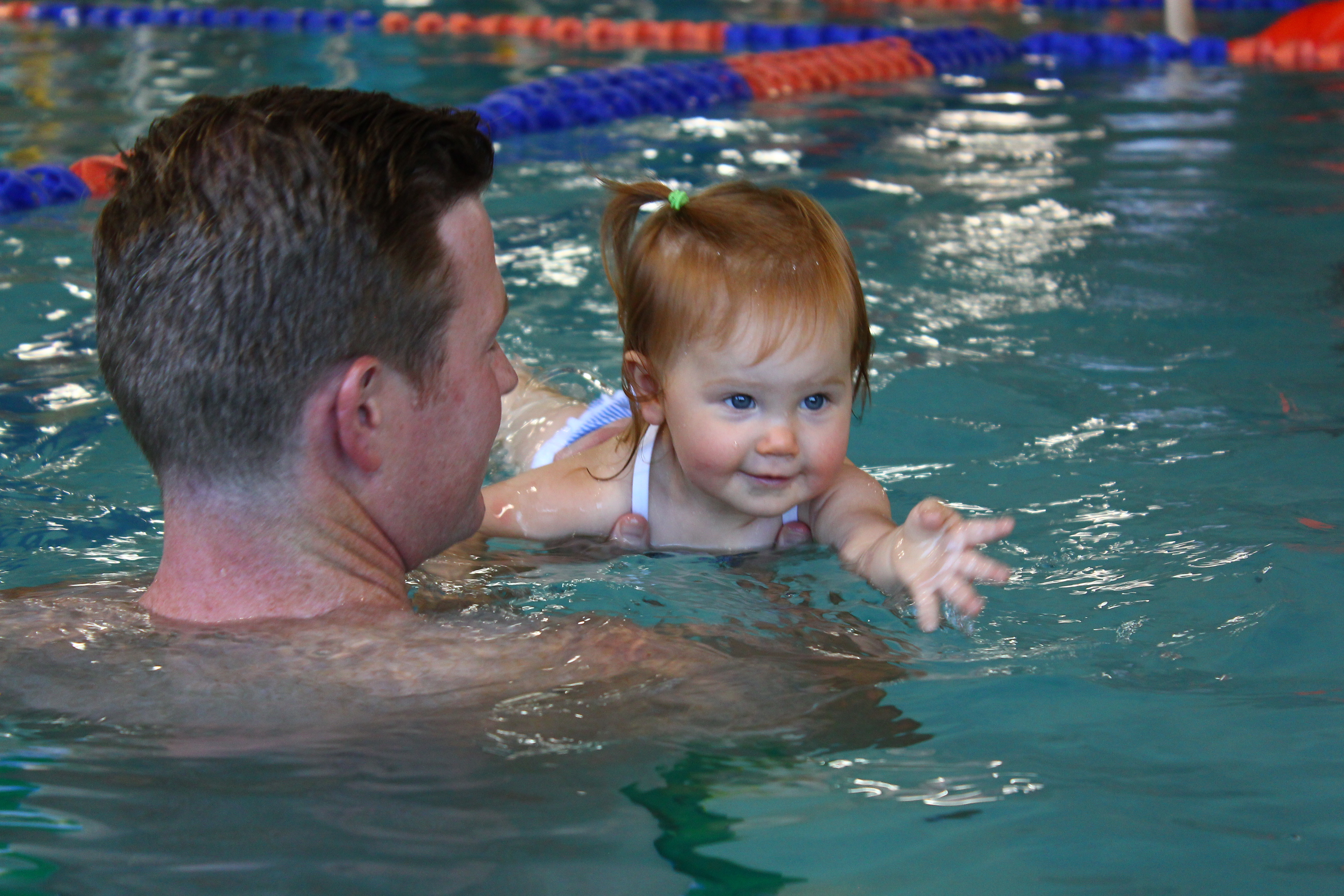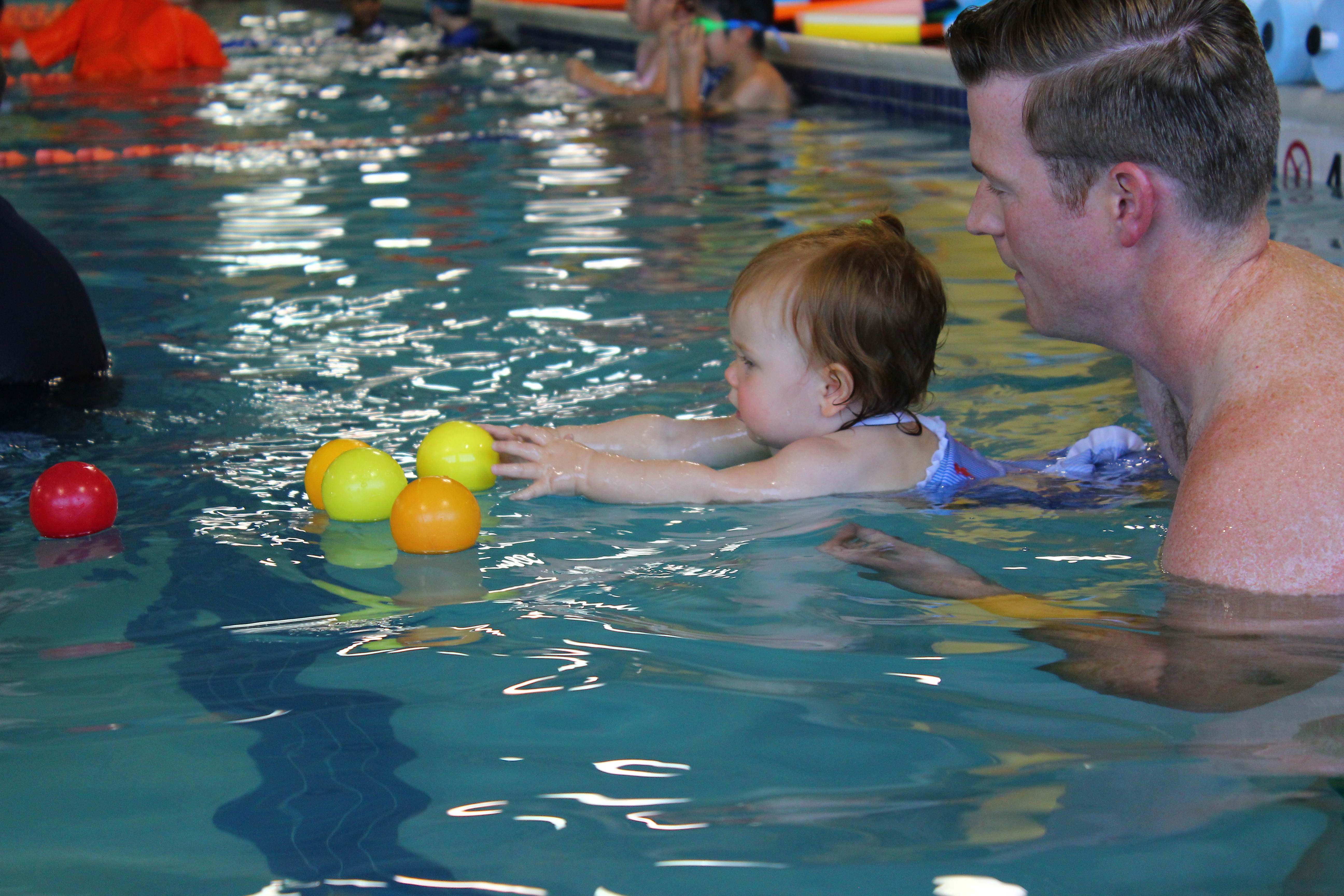 1. Action WordsEach swim class focuses on actions. Your child will be kicking, reaching, climbing, jumping etc. You will be labeling and modeling the action for your child and then help your child replicate the action. Understanding and using verbs are important for beginning sentence building. Every simple sentence that your child will begin to put together will contain a verb. Below you see my babe reaching out as she learns to swim. With each stroke, the instructor and parents say the action word, in this case “reach,” that they want the children to perform.