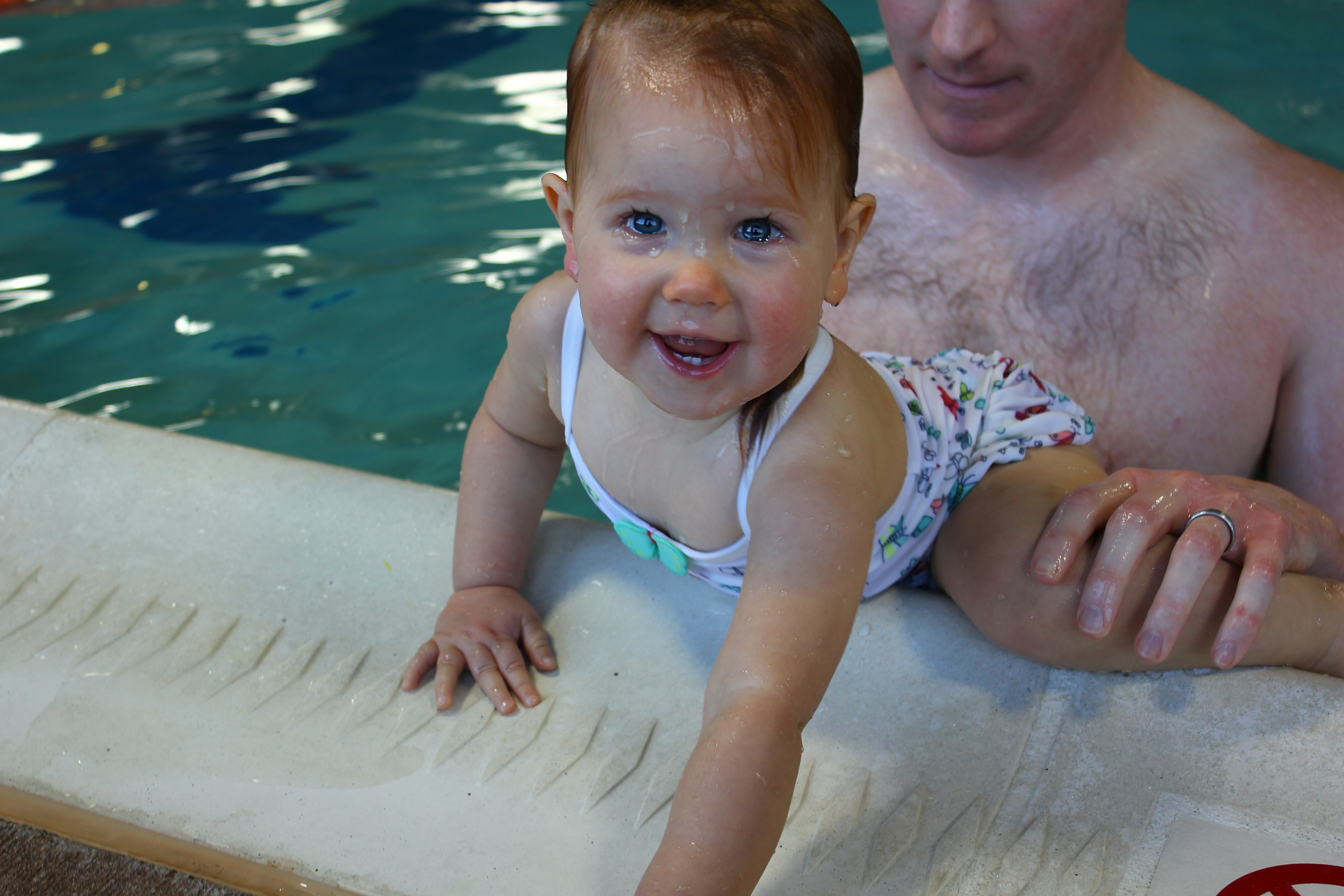 Let Go: The end goal for all of these swimming lessons is for your child to be an independent swimmer, right? At 14-months old, I have a hard time letting go of my daughter anywhere, let alone in the water. Goldfish Swim School provides moments for you to “let go” of your child and allow them to be safely independent in the water. These moments include having your child sit next to you on the pool ledge, glide a very short distance from your arms to the instructors arms, and have them crawl/walk across a floating mat (pictured below).