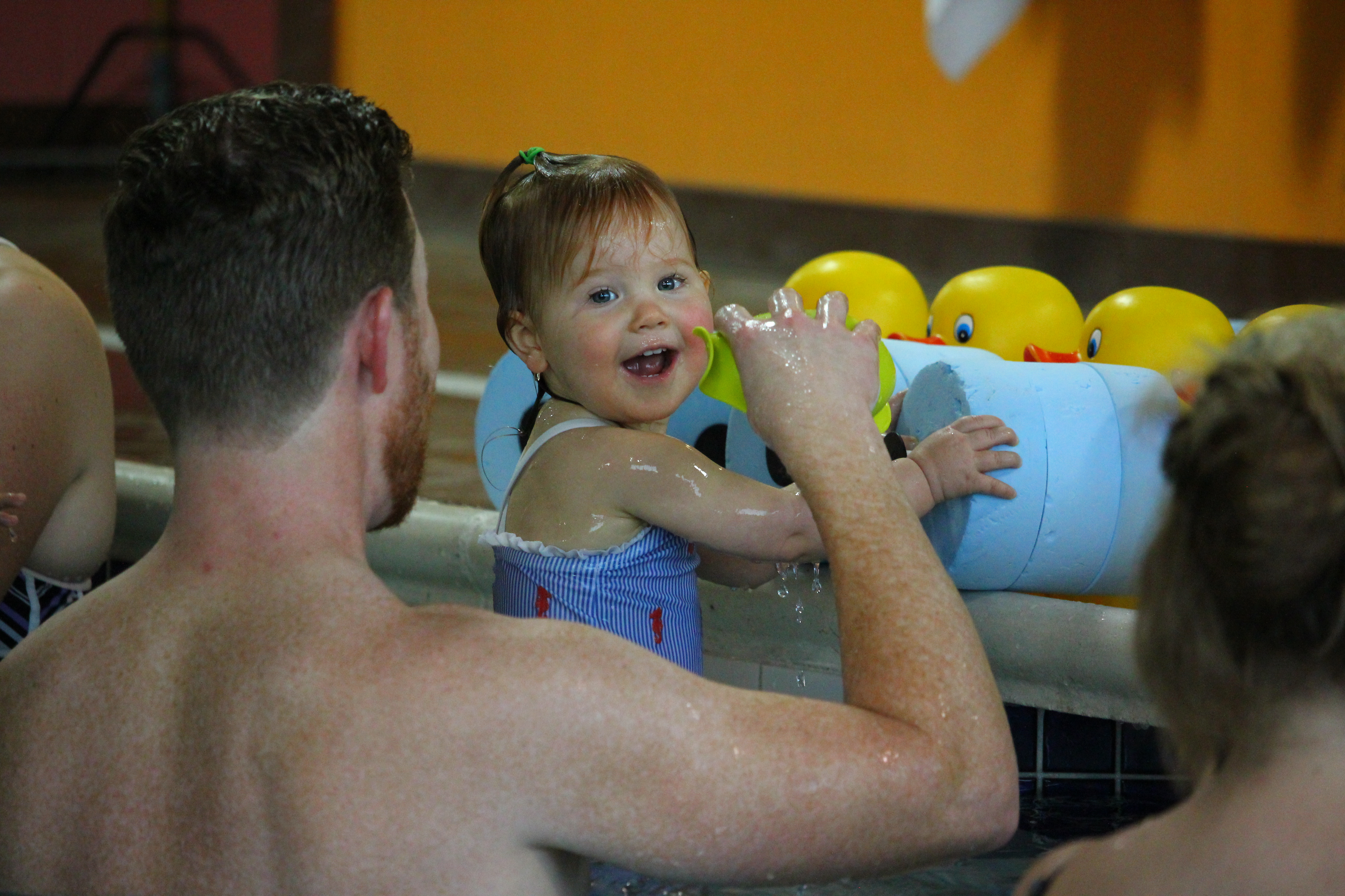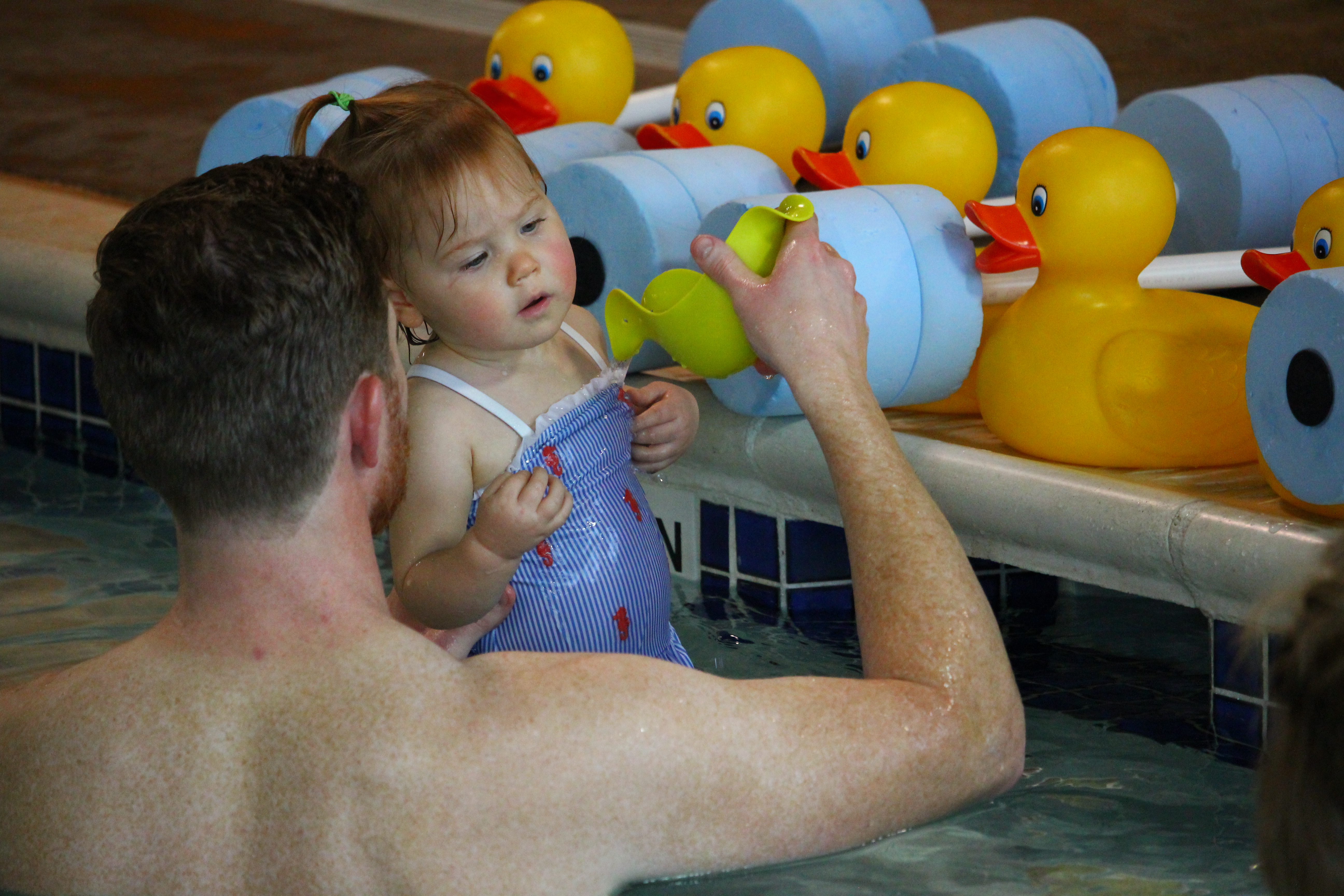 Each lesson, your child will acclimate to the water with water conditioning. A duck cup is provided for you to pour water on your child, starting with her arms and working up to her head. The instructor will talk you through how to pour water and will encourage you to pour water on your child’s head “when your child is ready.” Throughout the lesson waiting for your child to be ready is encouraged. The instructor guides you to watch your child for cues that she is becoming comfortable in the water and is ready for water on her face and head.