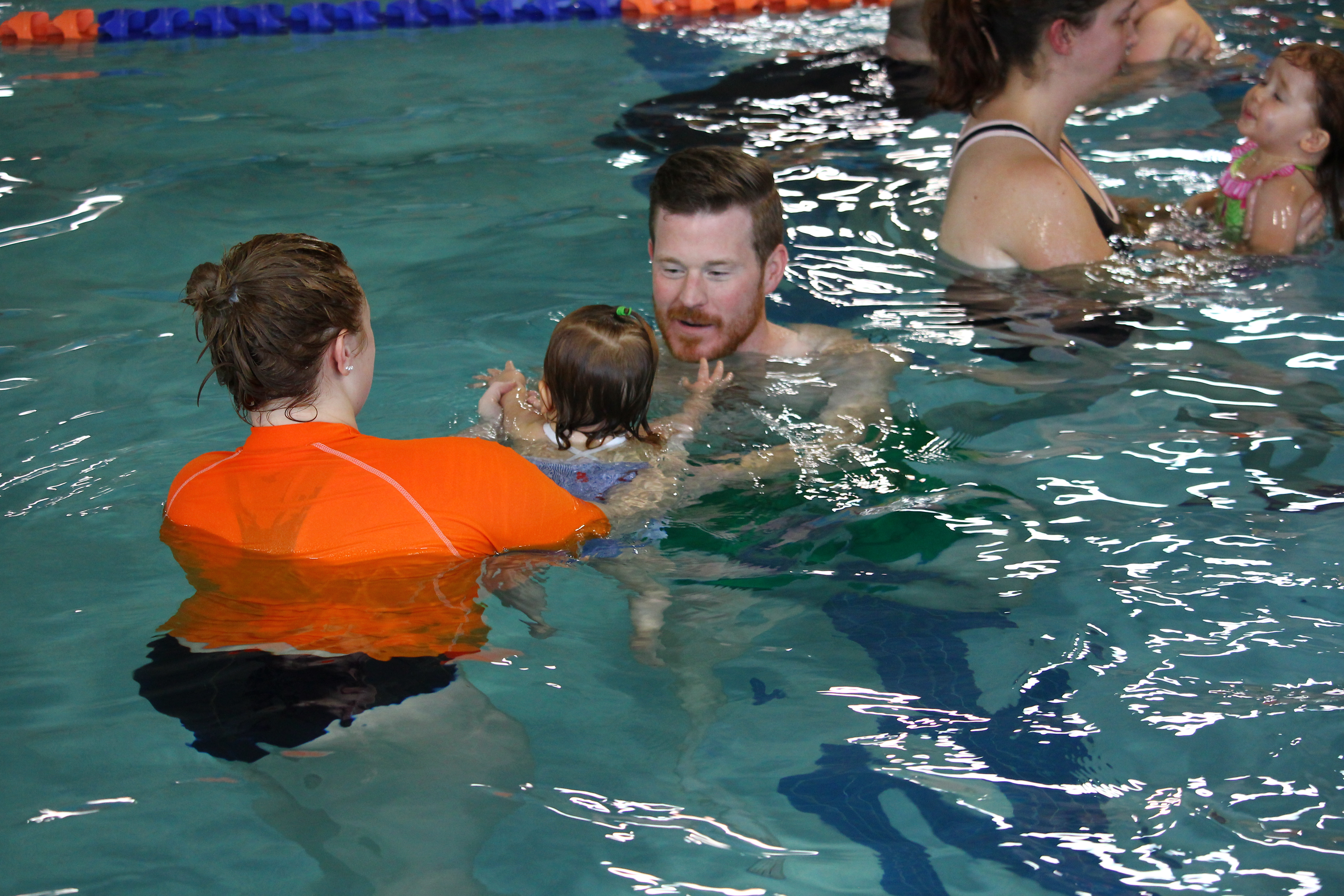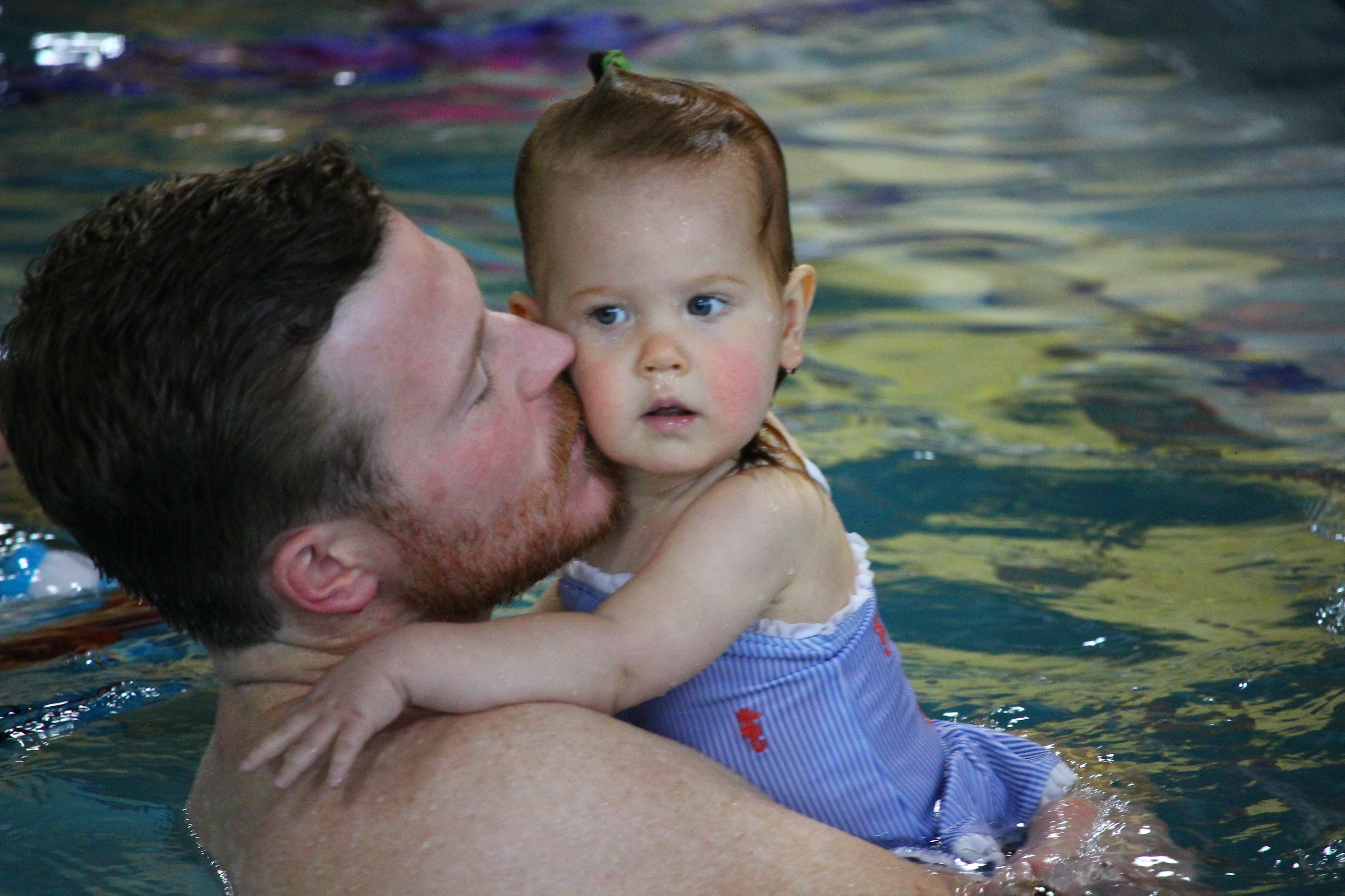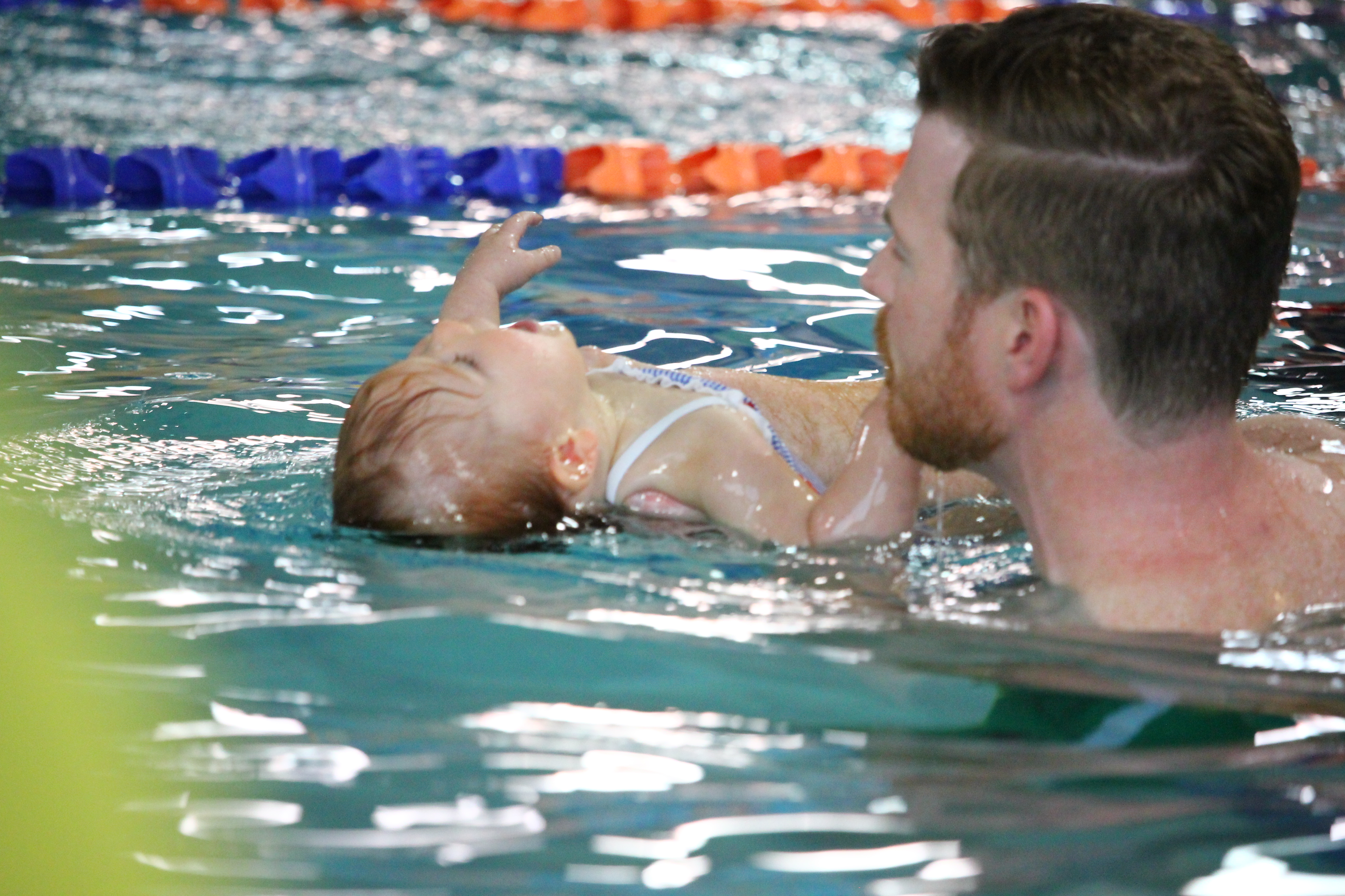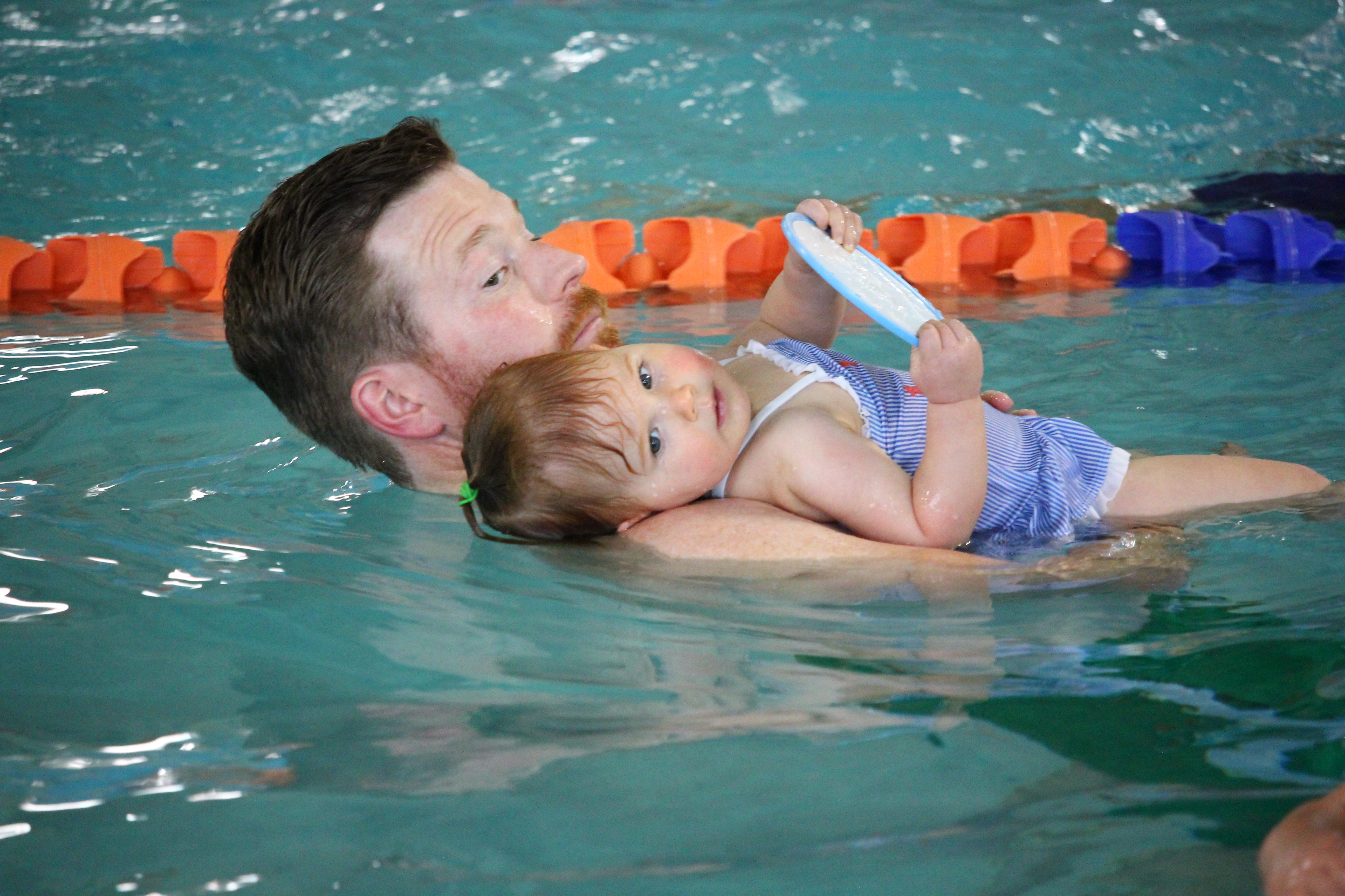 The instructor provides different levels of modifications to help your child learn a skill and become comfortable in the water. With the otter float (pictured below), your child can lie back on you for support. As your child becomes more comfortable in the water, you will be provided with different modifications. We have never been encouraged to force our child’s head back into the water. With patience and continued exposure to this skill, my daughter is now relaxed in the water and will lie back on her own.