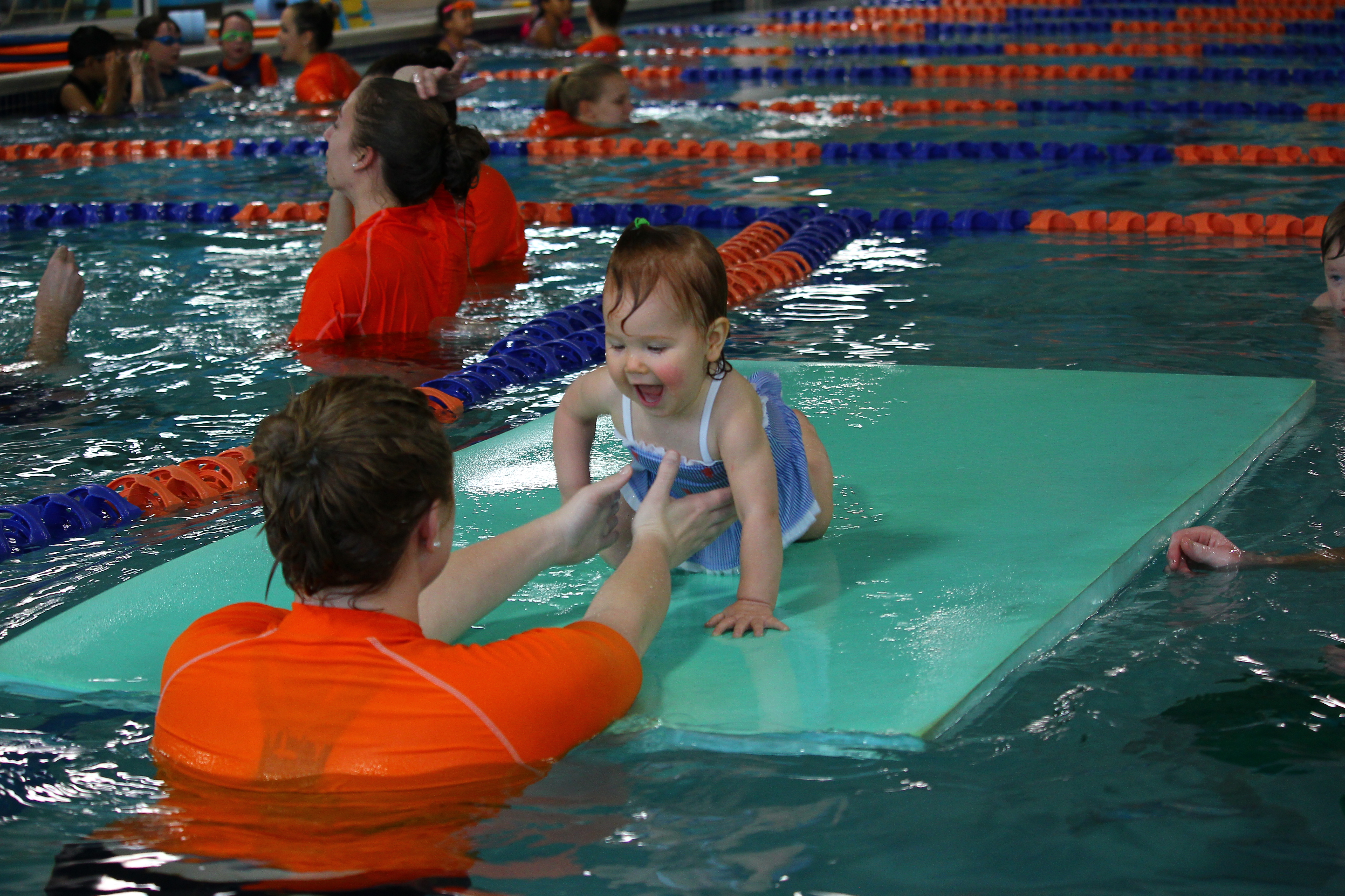 With each lesson, you will see your child’s comfort level in the water increase. Your child will be provided with opportunity to briefly separate from you to work on independence skills. Again, Goldfish will not force you to separate from your child. You will be guided to read your child’s cues and only let go when both you and your child are ready.