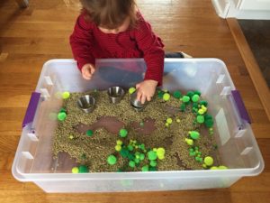 Put together an All things Green Sensory Bin. A sensory bin provides your child with a variety of materials and textures which stimulates the mind. There are no rules when it comes to playing with a sensory bin, it is self-directed learning and a chance for your child to have fun.