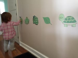 Set up a Green Walk down the hallway. I printed out common green objects, cut them out, and then taped them on the hallway walls. My daughter went up to each common objects and imitated a word or sound after I modeled it for her.