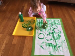 Green Pepper Stamping. We used green peppers to create a shamrock stamp. Baby girl followed the directions to “dip” the pepper into the paint and then “push” the paint onto the paper.