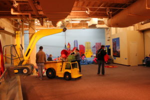 There were so many opportunities for my daughter to learn about the concept of up/down throughout the museum. She was very interested in the duplo center where she could build towers up and then knock them down. She was also interested in watching the play crane and dump truck. Children fill a basket with foam rocks, lift the basket up into the air and then watch the rocks fall down into the truck.