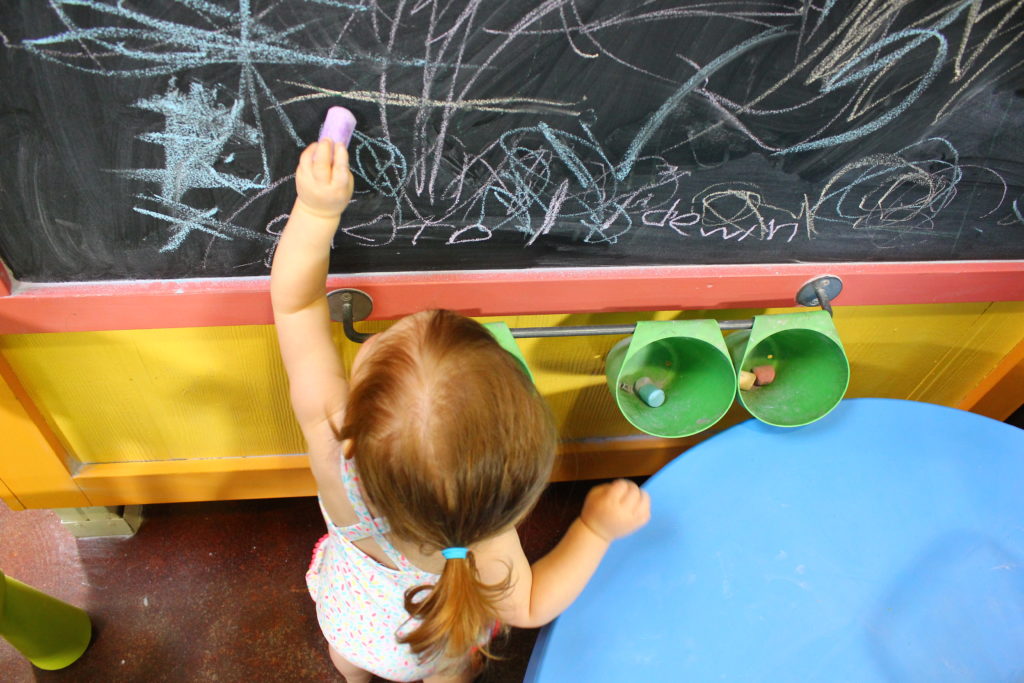 Goldfish has a lovely waiting room with books, toys, aquariums, and an art space. My daughter looks forward to drawing in the chalk area. She knows her routine: first change, then chalkboard. Once she changes, she makes a beeline for the chalk.