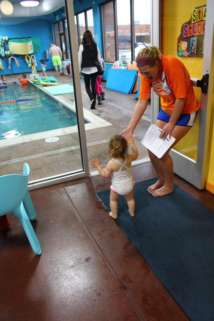 A five-minute warning is given before the next class begins. My daughter is just beginning to put together that when the warning is given, it is time to line up. At the start of the past few sessions, she has willingly put the chalk back into the bucket and made her way to the pool entrance when the five-minute warning is announced. Also, before each class there is an instructor at the entry door to give high-fives to each student on the way into class. My girl gets so excited in anticipation of giving a high-five.