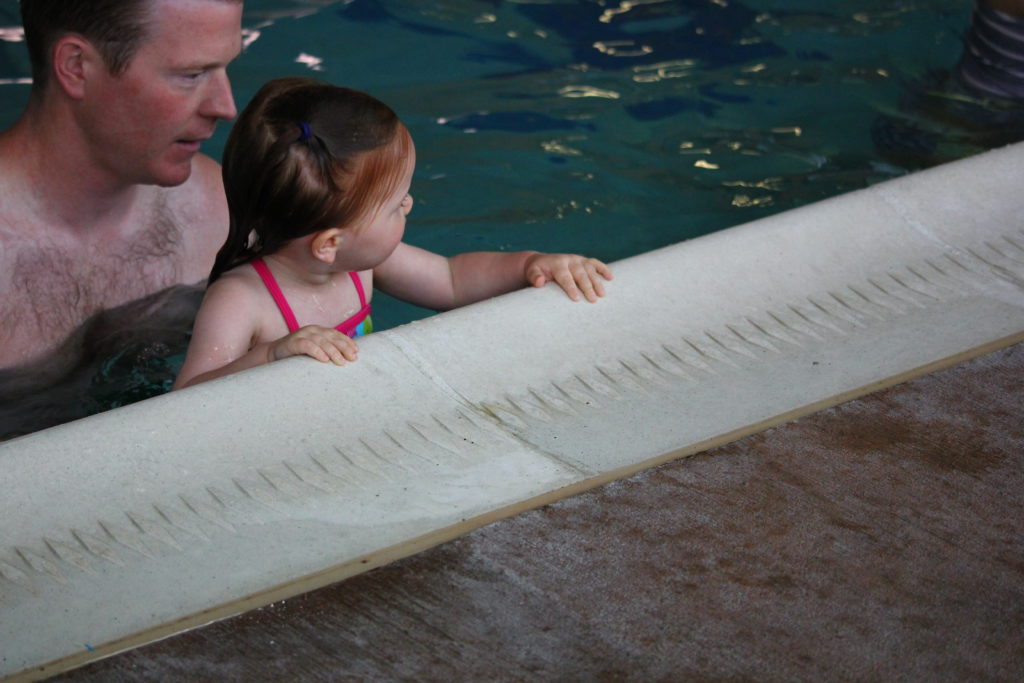 Click Clacks on the Wall: The final skill we practiced were “click clacks” along the side of the pool (walking her hands along the pool ledge). This helps her little body learn what to do if the water is too deep or she can’t swim to a ladder. She is also completing one heck of a bicep workout!