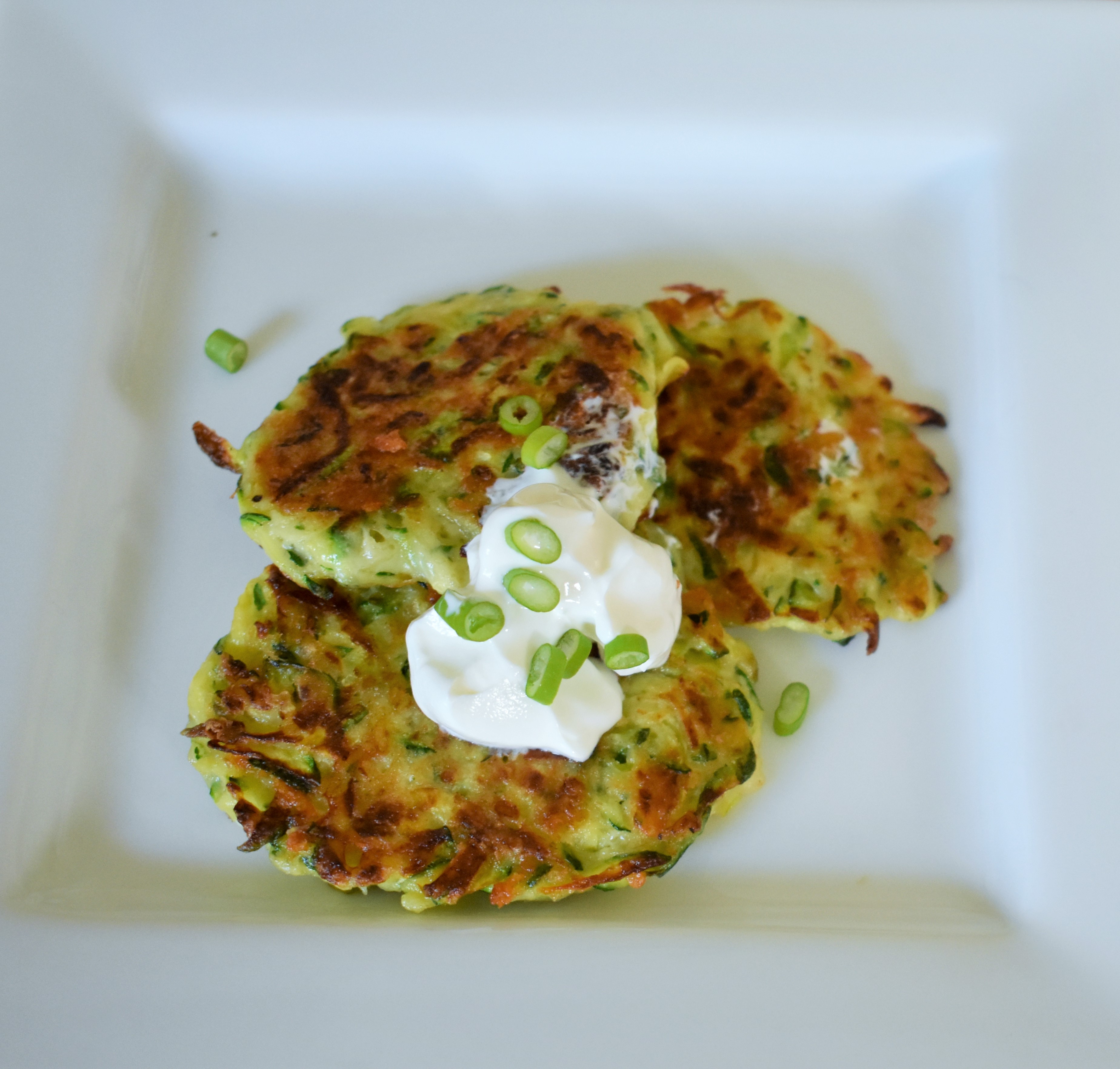 Serve the zucchini fritters topped with sour cream (optional) and sliced scallions.