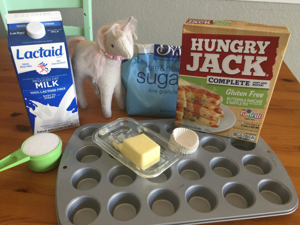And that’s when I found Smashed Peas & Carrots’ recipe for “Pancake Mix Muffins” [http://smashedpeasandcarrots.com/pancake-mix-muffins-recipe-egg-free-can-be-dairy-and-gluten-free/] that were also gluten free and egg free. It’s important to find a gluten-free specific recipe, as I’ve come to find out on more than one (unfortunate) occasion, because the various wheat substitutes don’t cook the same way, or for the same length of time, as their deliciously gluten-y counterparts. So we followed Smashed Peas & Carrots’ recipe and gathered all the ingredients. Then I added a unicorn to the picture just to be trendy. Cute, right?