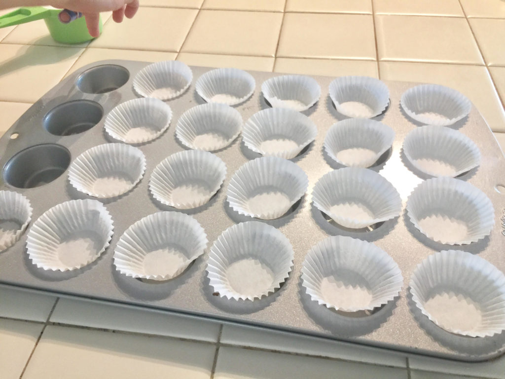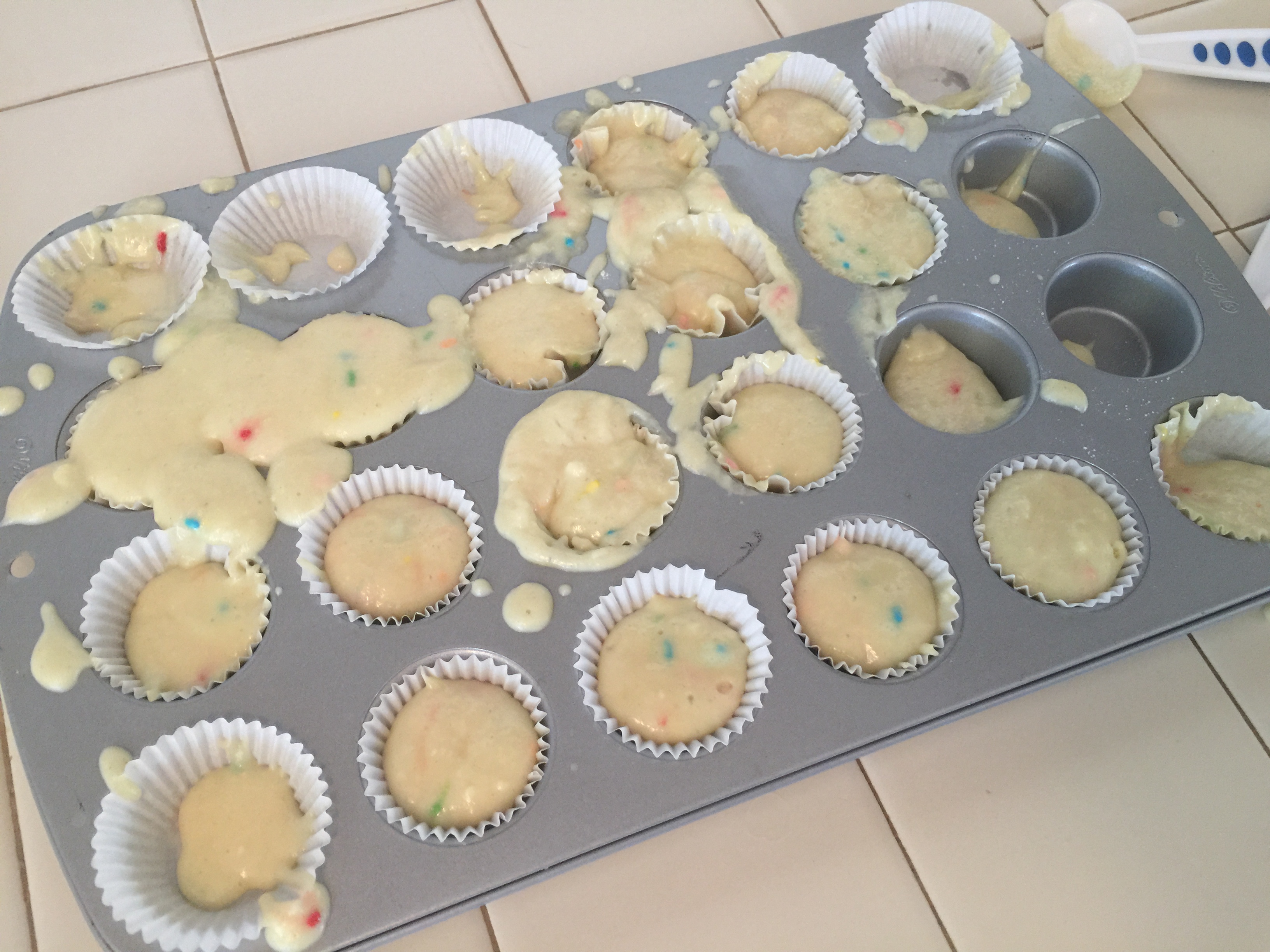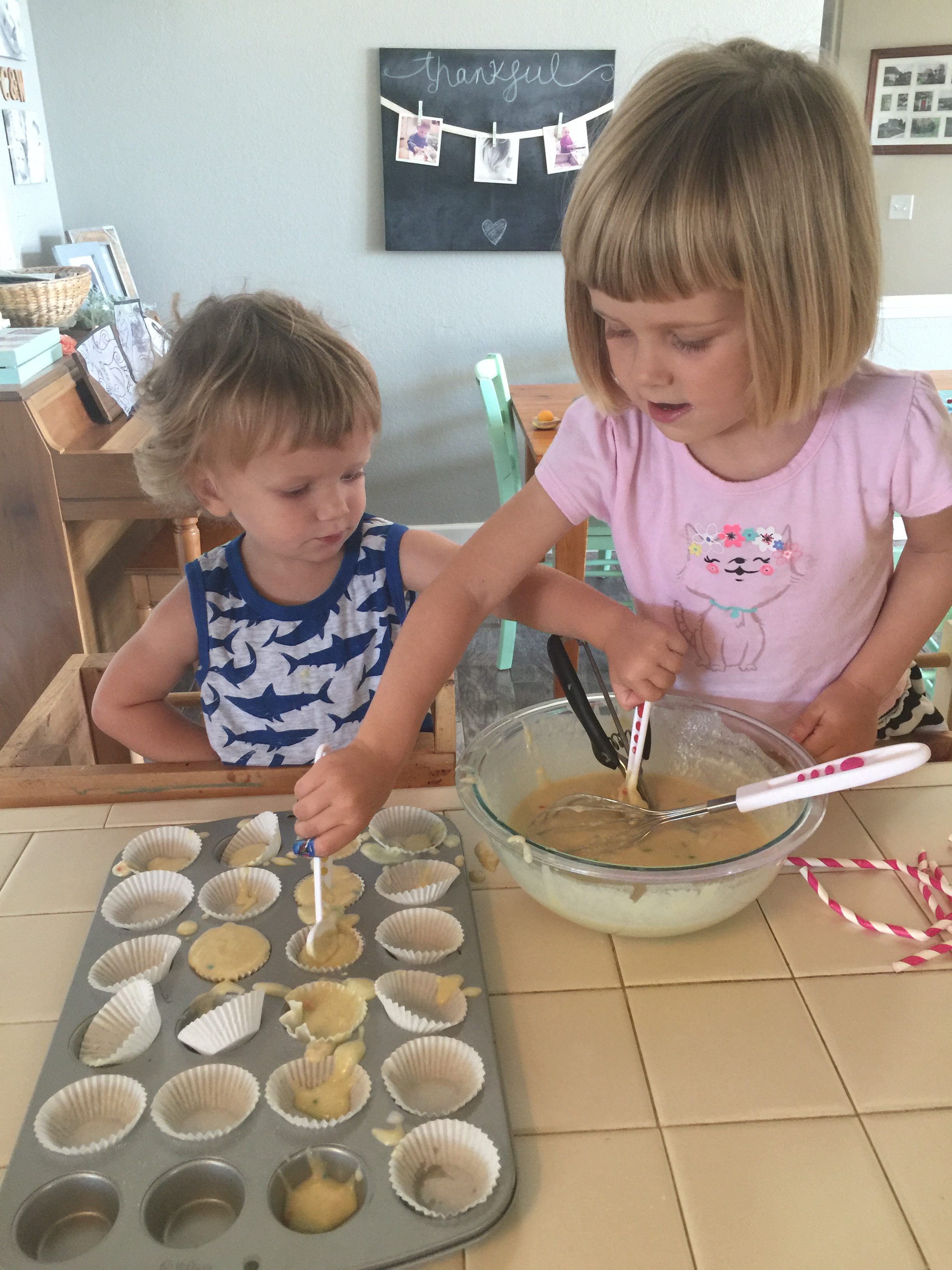 So we did all that stuff, mostly. Except I didn’t have any fun mix-ins, because, you know, it’s me. And since my kids are tiny humans with less than perfect measuring skills, they didn’t quite “fill the greased muffin cups ⅔ full.” They filled them like this: