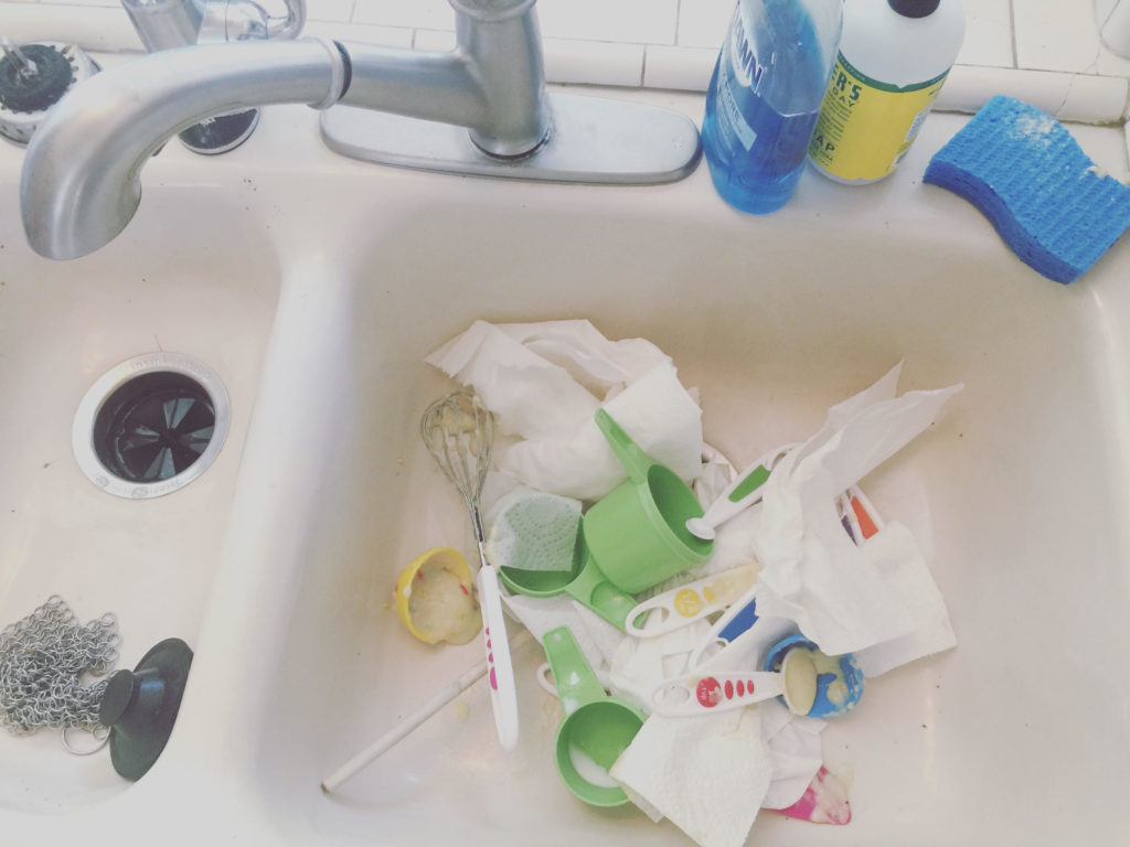 The kids gobbled up both types of muffins all the same. And really liked them! And that made me happy. Until I surveyed the true extent of the kitchen duty damage: piles and piles of wet paper towels, soggy with batter slopped on top of aaaaall the kitchen utensils.