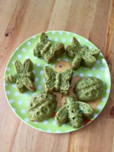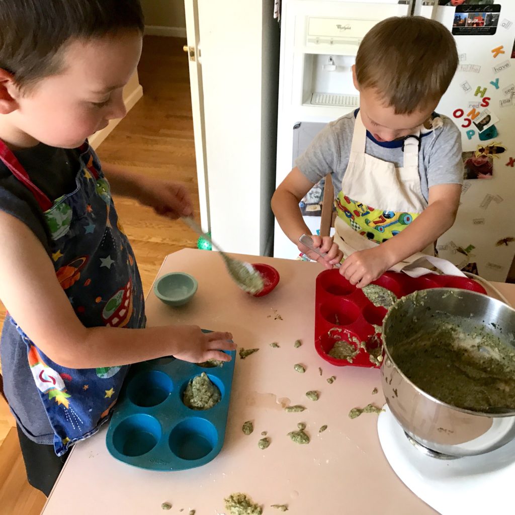 Of course, green cubes are only effective at getting nutrients into your kids if they’ll actually eat the meal you mix them into! My oldest currently refuses sauces (except ketchup) and all meat, so unfortunately he’ll completely reject most of the suggestions I just made above. But he will happily consume any baked goods I care to provide – which is how I came up with what we call “green banana muffins.”
