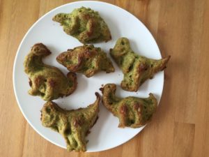 Mix ingredients and bake at 350 degrees for 15-30 minutes, depending on the size of your muffin tins. I recommend using paper liners or coating muffin pans with a non-stick spray. We have a couple of silicone molds just to make these muffins a bit more fun! (Though these days I have to admit I wish the dinosaur one was nothing by T-rexes, because both boys tend to get upset when the T-rex muffins are gone haha!)