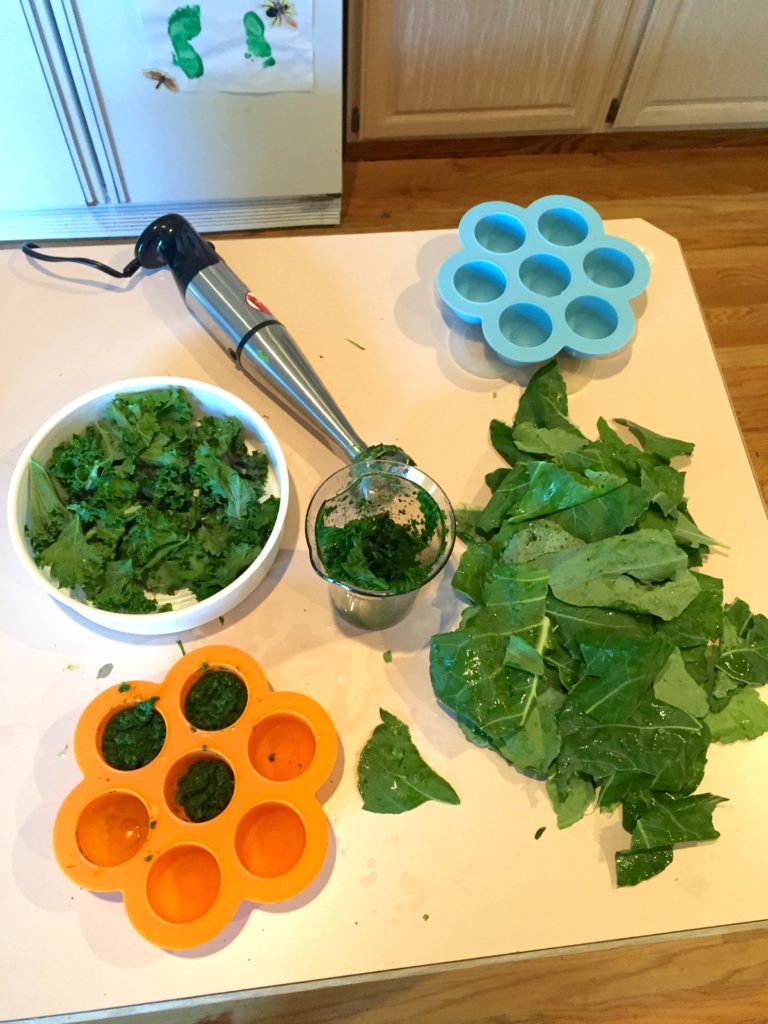 So, instead of letting the greens go to waste, I make a batch of green cubes. This involves gently steaming the greens, pureeing them, and popping them in the freezer. I use an immersion blender and one of those baby food freezer trays – because that’s what I happen to have – but a food processor and a regular ice cube tray would work just as well.