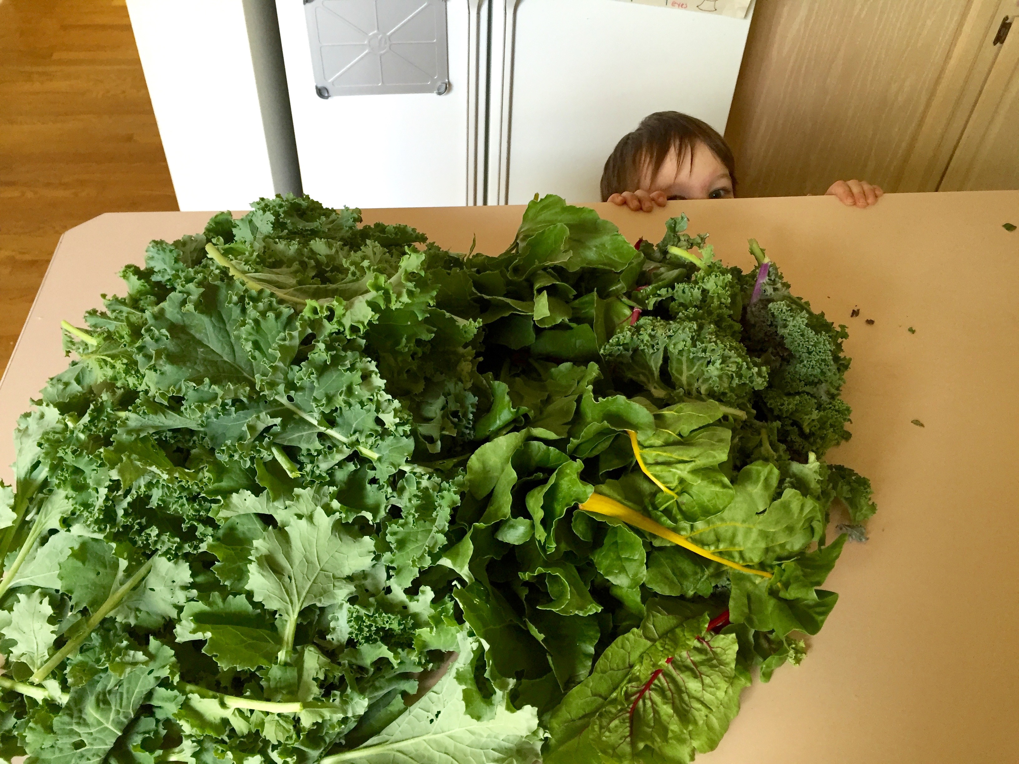 In the summertime, we belong to a CSA, which stands for “community supported agriculture.” Basically this means we pay upfront to support a local farm, and then visit the farm once a week all summer and most of the fall to pick up our share of whatever the farm produces. This generally includes a huge variety of greens – spinach, kale, chard, beet greens – and between the CSA and our own garden I often end up with a literal mountain of greens that we have zero chance of eating before it wilts (particularly since the kids won’t eat it fresh at all!)
