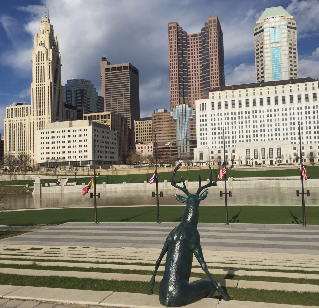 Find the deer statues along the Scioto Mile. What can the deer see from their spot on the water?