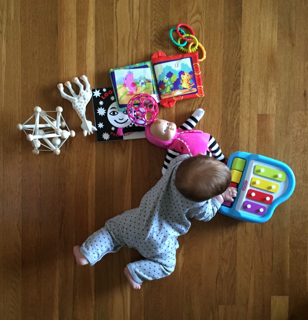 Mirrors: Mirror play support baby’s ability to focus, track images, and explore faces (both his and yours). It promotes social development as baby interacts with you and his siblings. I recommend choosing a durable play mirror like this, but I have also been known to pull our full length mirror off the wall for baby to explore.