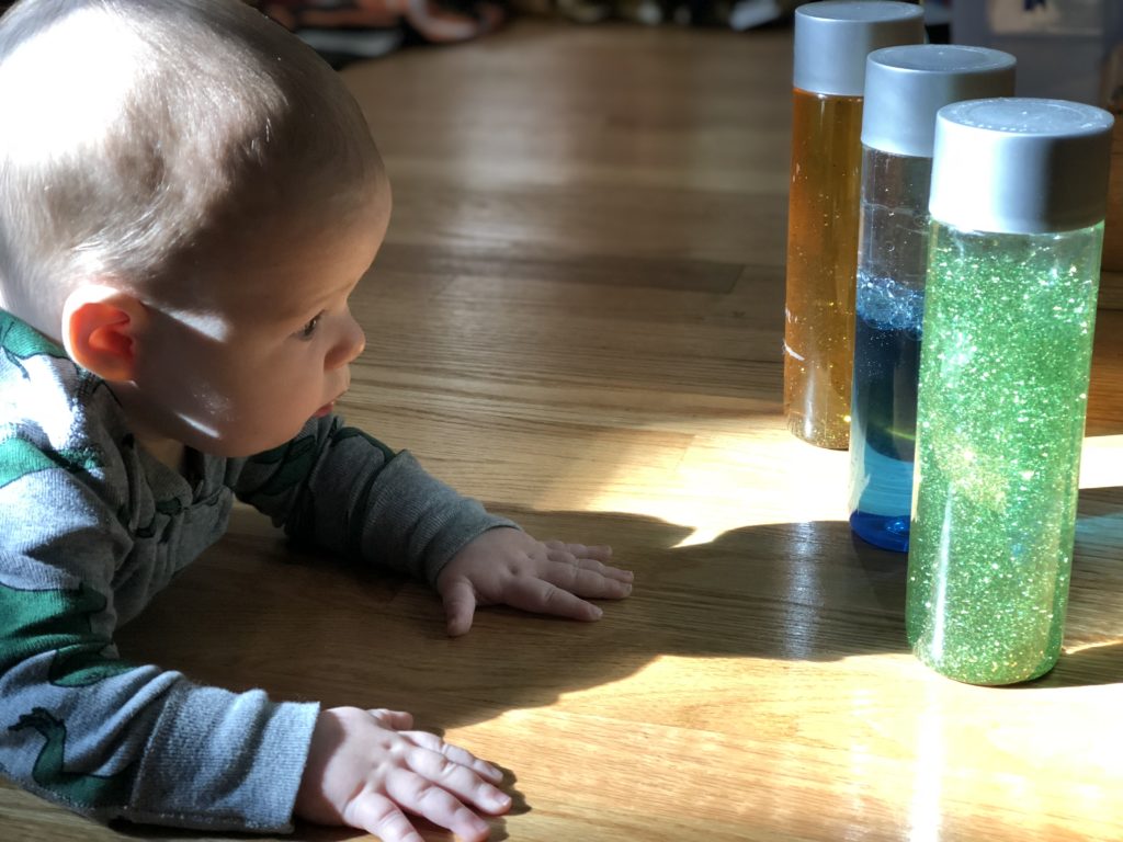Sensory Bottles: These can be created and used as baby grows. Quiet sensory bottles can be created to stimulate vision and noisy sensory bottles can be created to stimulate vision and hearing. The directions for our favorite glitter calm down bottle can be found here.