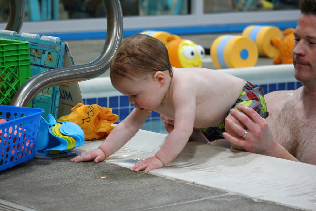 Wall Walks: We help P practice walking with his hands down the wall. This helps his little body learn what to do if the water is too deep or he can’t swim to a ladder. He is also completing one heck of a bicep workout!