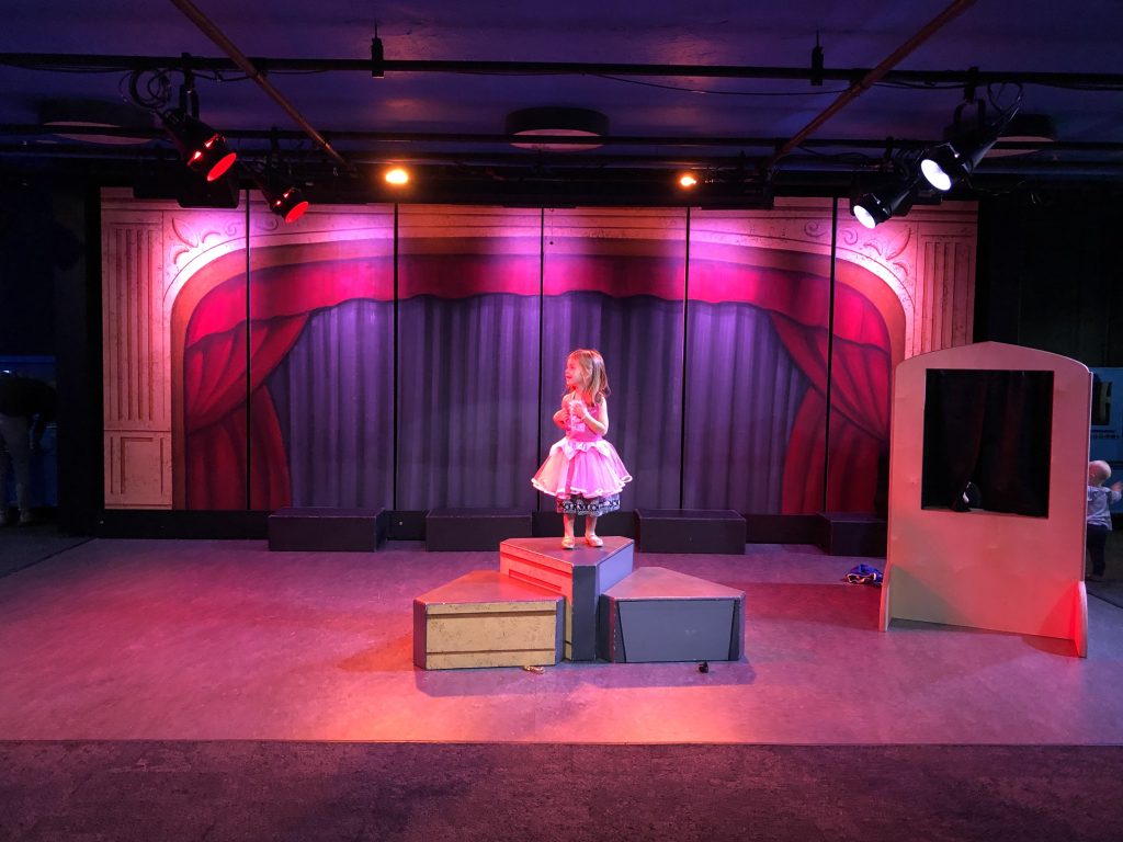 The Theater exhibit provides children with a chance to explore a realistic theatre setting complete with a back stage prep area, stage hand area, audience, and stage. My kids spent time getting ready in the hair & makeup and costume area. They then had fun adjusting the lights and creating sound effects for the show.